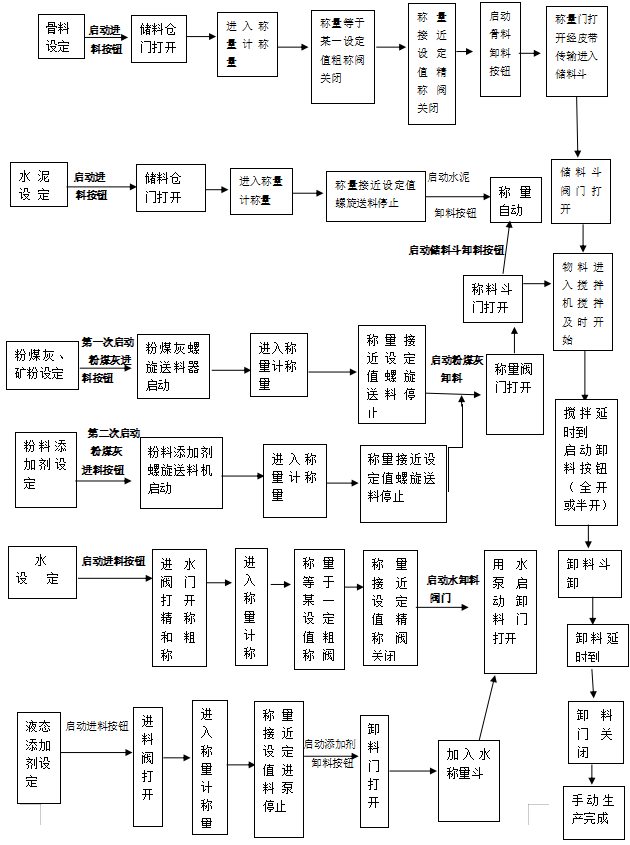 2.1.3 啟動(dòng)空壓機(jī),當(dāng)壓力達(dá)到0.4MPa以上時(shí),啟動(dòng)攪拌機(jī)、斜皮帶機(jī)、平皮帶機(jī),并按自動(dòng)按鈕,系統(tǒng)自動(dòng)運(yùn)行。系統(tǒng)自動(dòng)稱(chēng)量,稱(chēng)量后的骨料(石、砂)送入儲(chǔ)料斗,再進(jìn)入攪拌機(jī),粉料機(jī)和添加劑由稱(chēng)量斗進(jìn)入攪拌機(jī),配料完畢。